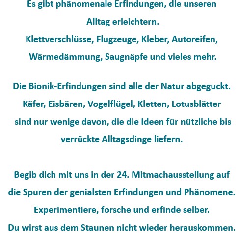 „phänomenalen Naturtalenten und ErfinderInnen“. Tatorte sind Wald und Wiese, Seen und Meere, Himmel und Erde, aber auch Dachboden und Keller. Die Naturtalente sind Tiere und Pflanzen. Sie sind wahre Künstler, denn viele Fertigkeiten, Eigenschaften und Fähigkeiten in unseren Umgebungen sind den Lebewesen aus der Natur kopiert und genutzt für tolle Objekte und Gebrauchsgegenstände bis in die heutige Zeit. Wer Lust hat, an dem spannenden Thema zu tüfteln, der ist bei den Forscher – Kids herzlich willkommen. Basteln, forschen, experimentieren ,kleine Ausflüge und noch vieles mehr stehen bis Juni 2026 auf dem Plan.